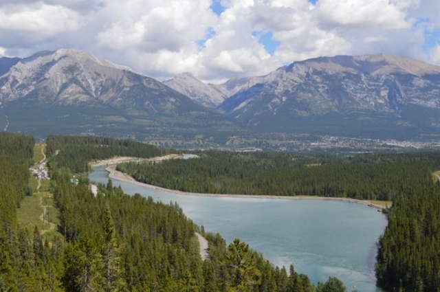 難しいコースを行くと、ランドル貯水池とキャンモアの街が一望できます。少しずつ標高が上がっているのがわかりますね。