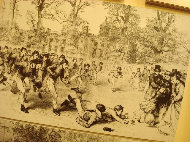 今ではすっきり整備された美しいコンディションのフィールド。でも当初は羊たちの放牧地も兼ねていたためその糞なども地面にあり、泥だけでなくドロンコになって匂いも凄かったと云います。ちょっとした群衆のような大人数でボールを追っていた19世紀の絵画といい、かなりワイルドな光景だった事でしょう。