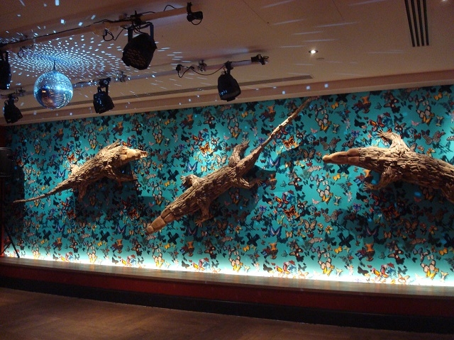 天井からミラーボールが下がっているから、きっとここはダンス・フロアー。ワニを模したアート作品が、ユーモラスで強烈なインパクトですよね。
