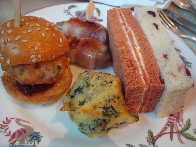 ターキーのミニ・バーガー、ホウレン草のケーク・サレ、小さなソーセージにベーコンを巻いたピッグズ・イン・ブランケット(毛布に包まれたブタ)。フィンガー・サンドウィッチはスモーク・サーモンとクリーム・チーズでした。どれも美味しくて、量もちょうど良いのです。