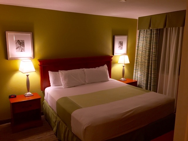 グリーンを基調にオレンジ系のヘッドボードとエンドテーブルは、落ち着いて温かみのあるベッドルームです。クローゼットもかなりの大きさです。