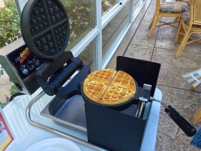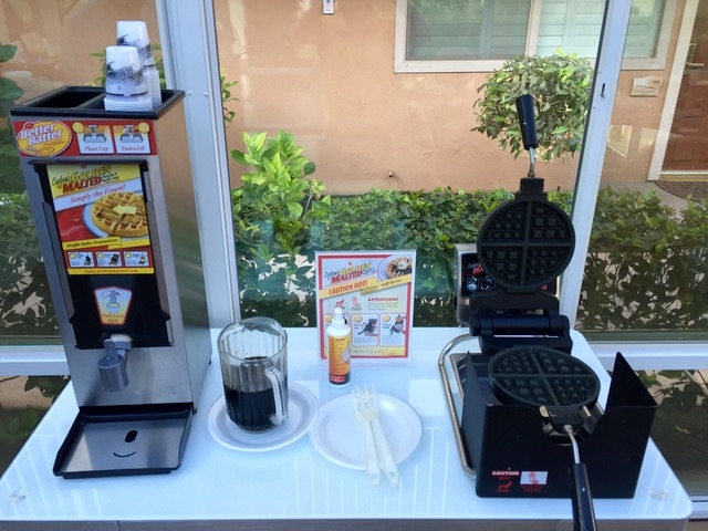 出来上がったワッフルは、取り出す用フォークを使ってお皿に盛り付けます。本当はフタの方にワッフルがくっついてもっと取り出しやすいのですが、下にくっついちゃうんです。郊外のモーテルなどにも設置している事があるので見かけたら挑戦してみてくださいね。