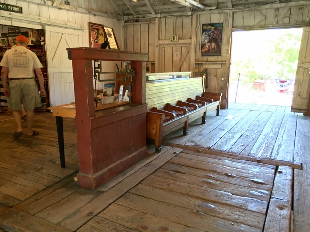 木製のベンチも十分当時を偲ばせるのです。手前の板の目が向きが変わっていますね。その部分が台測りになっていて荷物の重さを測るんです。トラックとか車体の重量を測るのと同じ方法です。既に使われていないのでそこに上がっても体重は標準されません。