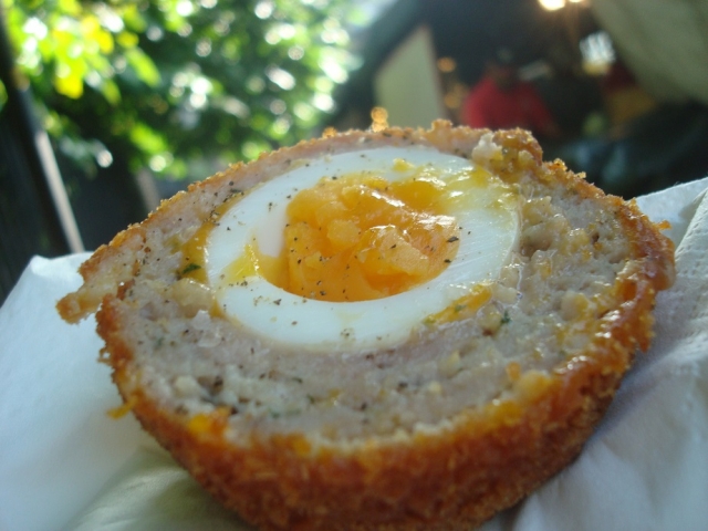 ここで食べた熱々のスコッチ・エッグがは逸品でした。カリっと香ばしく揚げられた衣、絶妙に味付けされた豚ひき肉、そして中から半熟卵の黄身がとろ~っと・・・う、旨い!