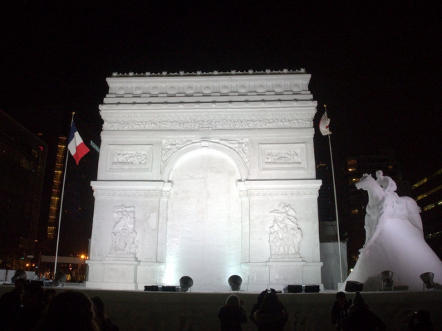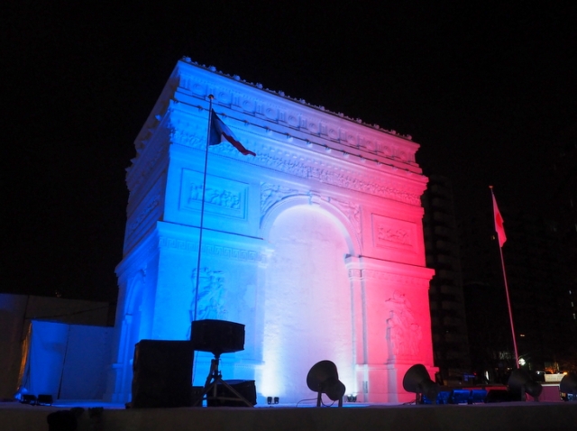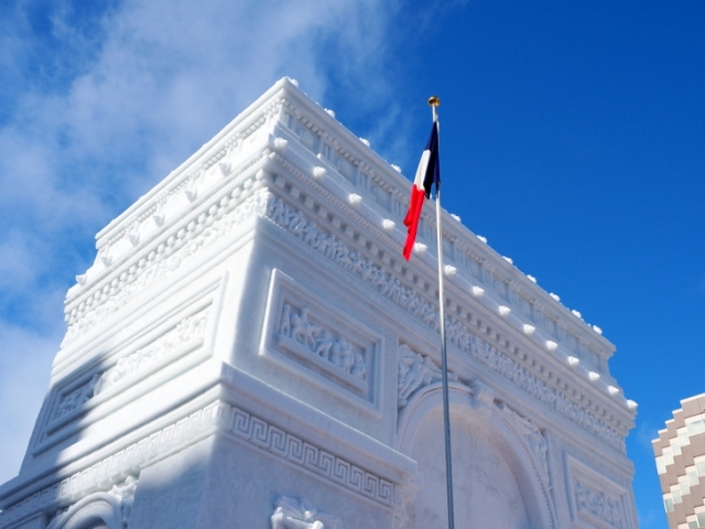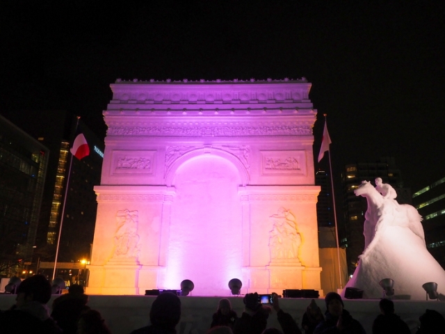 雪像の白さを強調したライトアップから、何色ものグラデーションを楽しむライトアップを経て、フランス国旗のトリコロールカラーへと移り変わります。思わず、何度も見入ってしまう色彩の美しさとともに、雪の白さを強調する無色のライトアップとそれによる影が、本物の凱旋門と見紛うほどです。