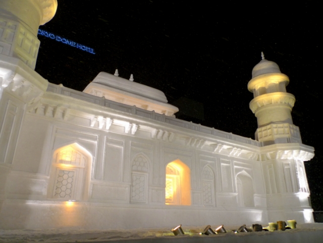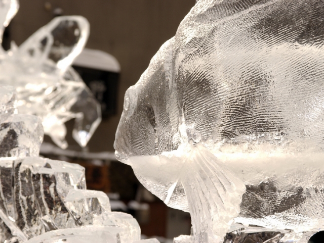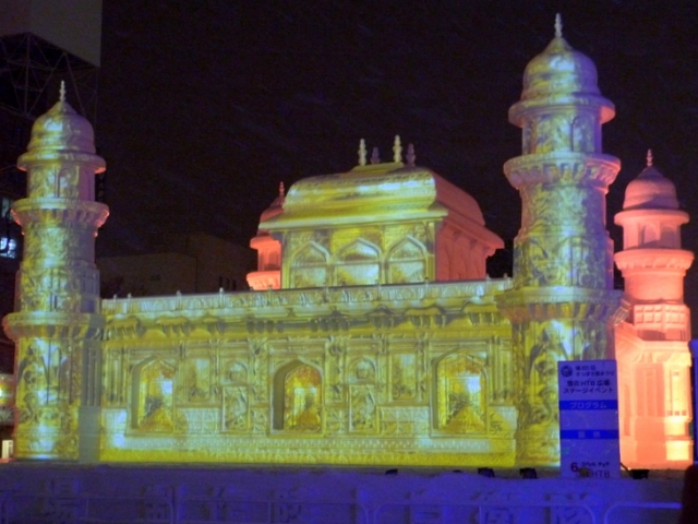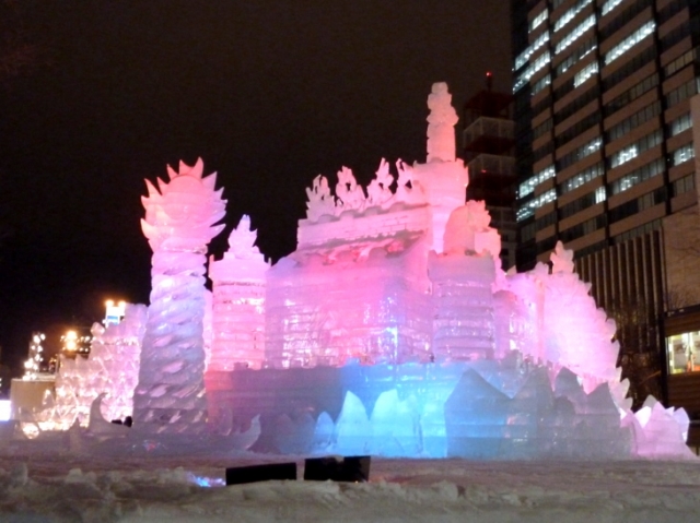 すすきの会場は、大通会場の大氷像とはまた少し趣が異なり、氷の彫刻の透明感が印象的です。
