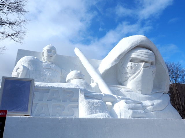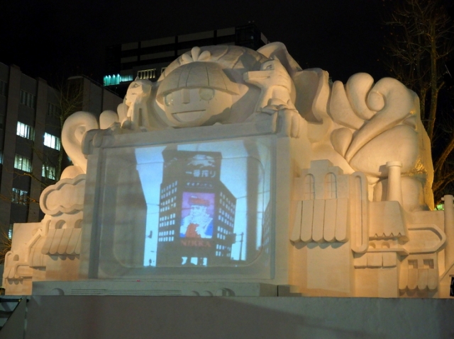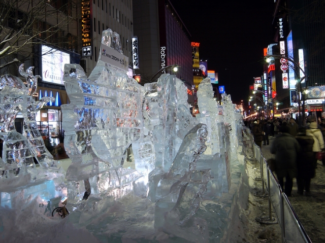 ネオンサインが有名な札幌の繁華街、すすきの。「さっぽろ雪まつり」では、札幌駅前通りの地下鉄南北線「すすきの駅」から「中島公園駅」までの区間が「すすきの会場」となり、約60基もの氷の彫刻が並びます。