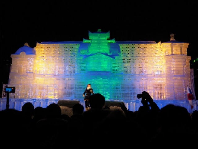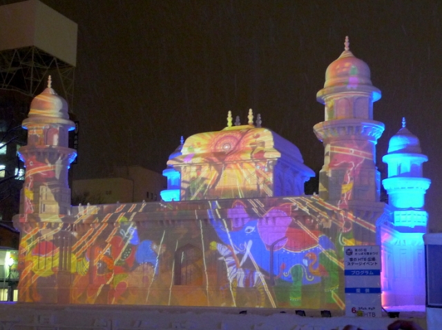 ライトアップの「静」の美しさに対し、プロジェクションマッピングはまさに「動」です。移り変わる映像に音の迫力や世界感が加わり、大雪像がひと回り大きくなったような錯覚に襲われます。