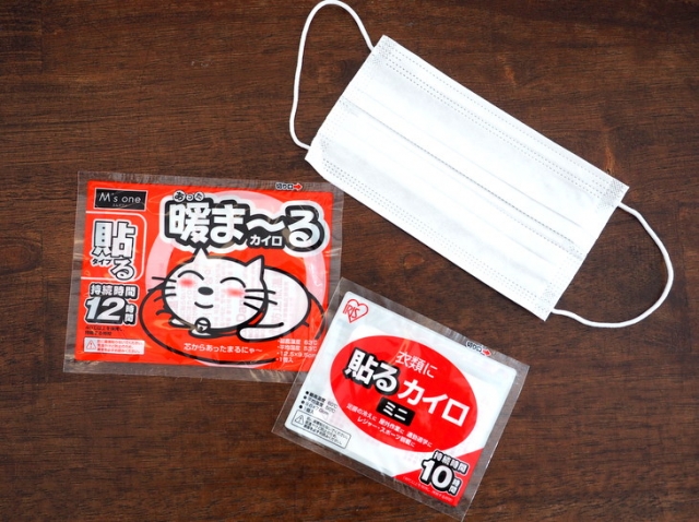 また、体が暖かくても手足が冷たくなることが多くあります。そこで、使い捨てカイロを持ち歩くと便利です。ミニサイズや靴用など、何種類かのカイロがあり、コンビニエンスストアやドラッグストアなどで購入できます。このほか、マスクが防寒にも重宝するので、携帯をおすすめします。