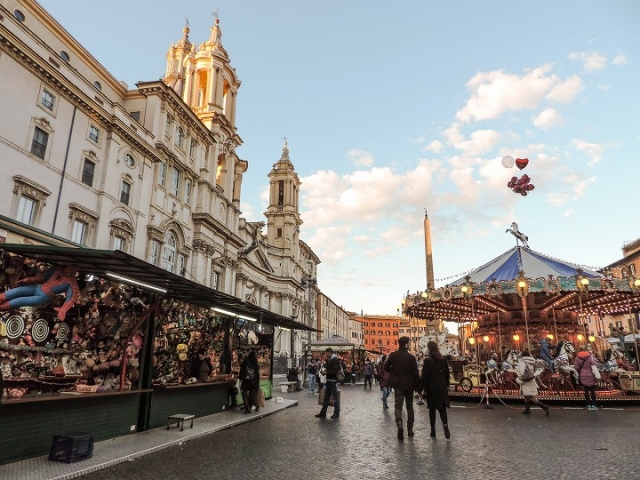 12月に入ると、ローマ中心部にあるナヴォーナ広場には、メリーゴーランドや日本の縁日の様な屋台が出て、多くの人が訪れます。旧市街にあるナヴォーナ広場は、パンテオンなどの見所が多く集まっている地域にあります。広場は、日本の旅行会社が主催するツアーの”ローマ一日観光”にはほぼ必ず含まれている有名な観光スポットです。