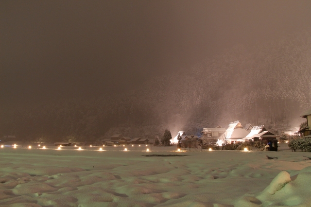 この「美山かやぶきの里」を舞台に、2020年1月25日(土)から2月1日(土)までの期間、ライトアップイベントが開催されます。雪化粧をしたかやぶきの古民家がやわらかな灯廊の明かりで彩られます。