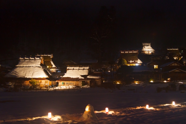 冬に訪れたいもうひとつの京都の絶景は、「美山かやぶきの里」の雪灯廊です。「美山かやぶきの里」は、京都府の中央に位置する南丹市美山町の古民家集落のこと。「美山かやぶきの里」には、かやぶきの古民家が38棟現存しており、その貴重な古民家集落は国の重要伝統的建造物群保存地区に指定されています。