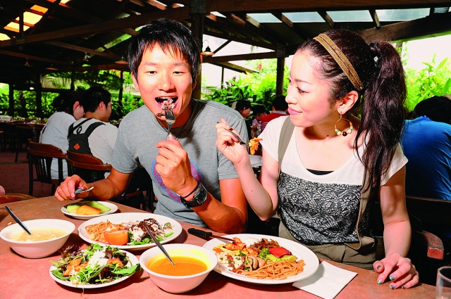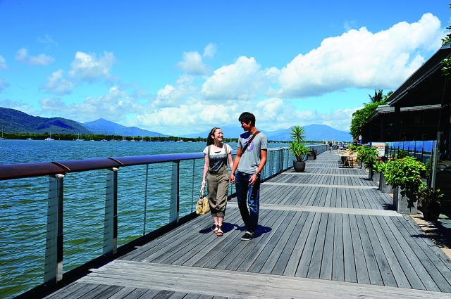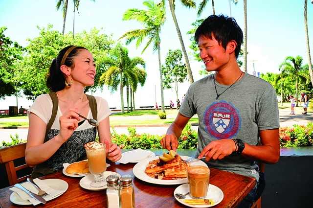 ケアンズは、人口12万人ほどの小さな町です。町の中心、エスプラネードに続く海沿いのボードウォークは、地元の人にも人気のおさんぽコースです。朝ごはんは、町なかのオープンカフェ「ラ・ピザ・トラットリア・バー・カフェ」で。焼きたてのワッフルや、オーストラリア流のアイスコーヒーを味わいましょう。