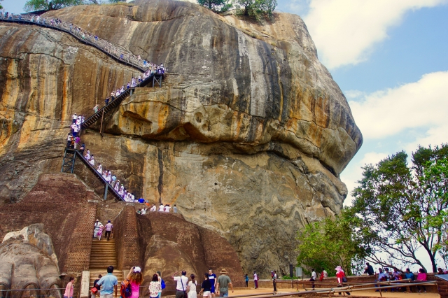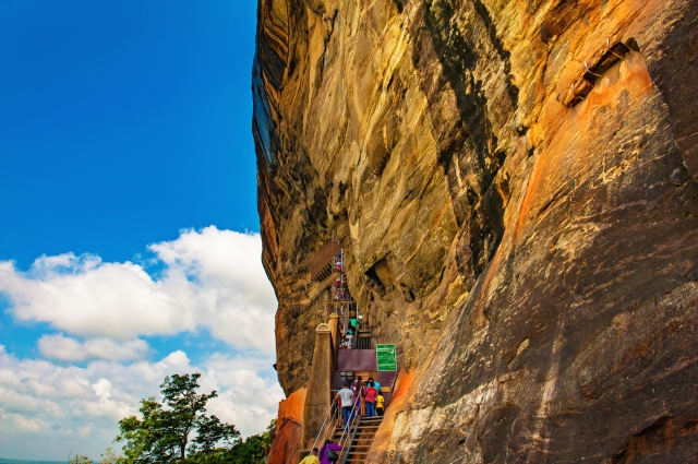 広大なジャングルの中、垂直に切り立った巨岩の最上部に造られた「空中宮殿」。そこに行くには、高さ約180m、南北約400mの巨大な岩山の側面に造られた階段をひたすら上っていかなければなりません。いざ上ろうとシーギリヤロックに近づくと、あまりの大きさに少しひるんでしまいます。