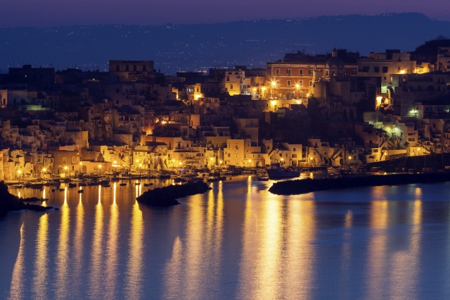 ナポリの夜景の見どころと言えば、橙黄色の灯りでしょう。「スパッカナポリ」と呼ばれる一直線の通りを中心とした旧市街地が、間接照明のようなやわらかな灯りに包まれます。ナポリ湾に目を向けると、ヨットが停泊するおだやかな水面が淡い光に揺らめきます。