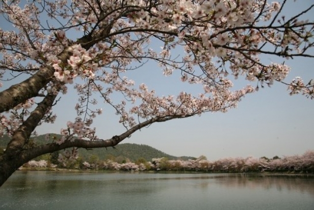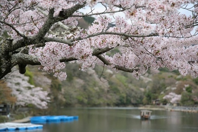 桜の時期の大覚寺でお勧めなのが、日本最古の林泉式庭園である「大沢池」の桜景色です。平安時代に唐の洞庭湖を模して造られ、池畔を巡る散策路は約1キロ。