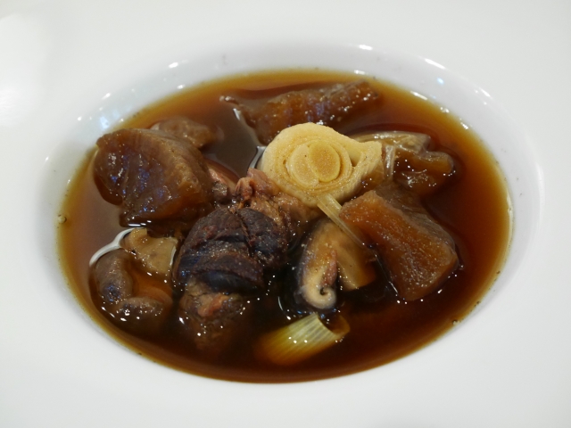 一品目は、地元の「寒干し大根」に飛騨ネギなどをじっくり煮込んで味を染み込ませたスープです。「寒干し大根」とは、輪切りにした大根を丁寧に串に刺して、寒中にさらして干し上げたものです。昔から飛騨の人たちに愛されてきた保存食でもありました。冬が寒い飛騨だから作ることができる名品です。フレンチでありながら、田舎風の煮物のようでもあって、どこか懐かしくて、おいしいスープでございました。