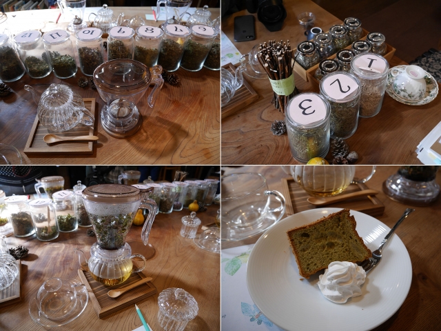つづいて、女将主催の「ティーセレモニー」では飛騨市で採れた13種類の薬草が並べられ、オリジナルの「ハーブティー」をつくる体験ができます。参加者は、その日の体調や好みに合わせて、13種類の薬草の中から最大4種類をブレンドし、実際に味わうことができます。筆者は、以下を選びました。