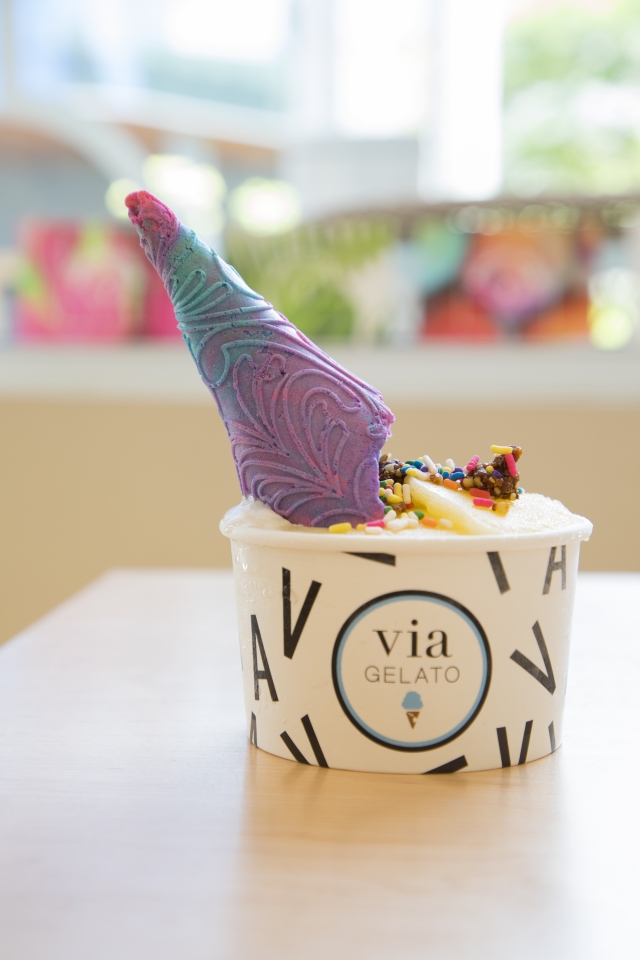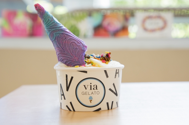アイスクリームネタでもうひとつ。地元の新鮮ミルクなどハワイ産の食材を使った手作りジェラートが話題の「ヴィアジェラート」では、まさにインスタジェニックなアイスクリームをオーダーできちゃいます。“ユニコーンフード”と伝えると、カラフルなコーンをユニコーンの角に見立てて、自分の選んだアイスクリームにのせトッピングしてくれます。写真は4種類まで選べるラージサイズ$6.80(ハウピア、リリコイ、カラマンシー)に、ユニコーンフード$1.60をプラスしたもの。誰もが「かわいいー」と叫びたくなる見た目は、溶けてしまう前に写真に押さえてSNSアップが必須。コーンも1枚1枚お店で丁寧に焼いているから、ジェラートといっしょにじっくり味わってくださいね。