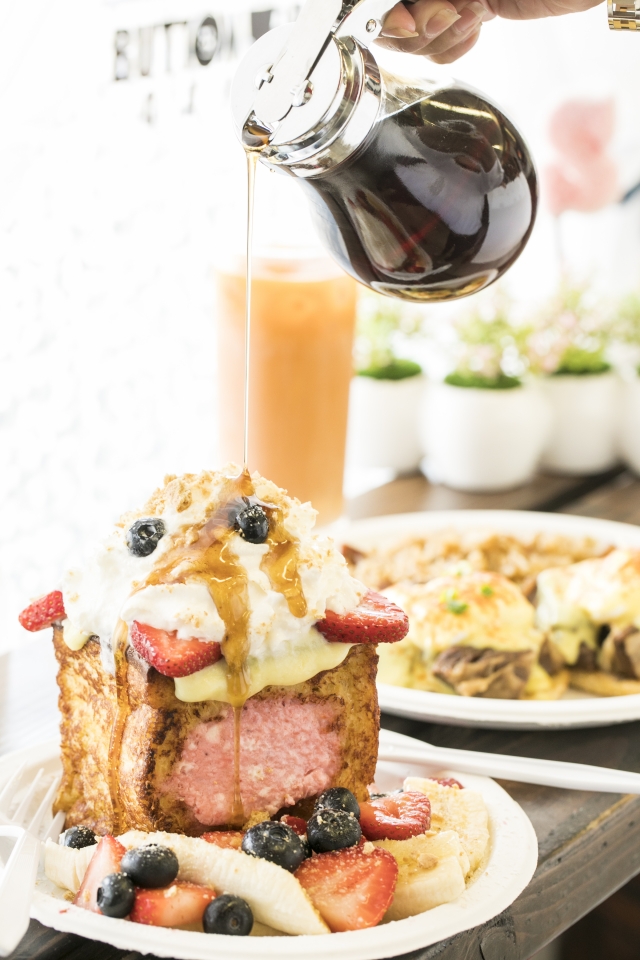 ひとつ目はパールシティにある「ボタンアップカフェ」の、スタッフドストロベリーチーズケーキフレンチトースト$8.95~。ハワイでフレンチトースト人気はずっと続いているけれど、この店のものはまず見た目が普通じゃありません!高さ約20cmあるスイートブレッドに、なんとチーズケーキがイン! トップには自家製カスタードクリーム、ホイップクリーム、ストロベリーがてんこ盛り(笑)。「こんなの絶対完食できないでしょ」と思いきや、食べてみるとフワフワブレッドが想像以上に軽く、ストロベリーの酸味が調和して甘すぎずペロリといけちゃいます。韓国系ロコのオーナーが考案した食事系メニューも人気だから、あれこれ食べたい人は数人で訪れてシェアしてくださいね。