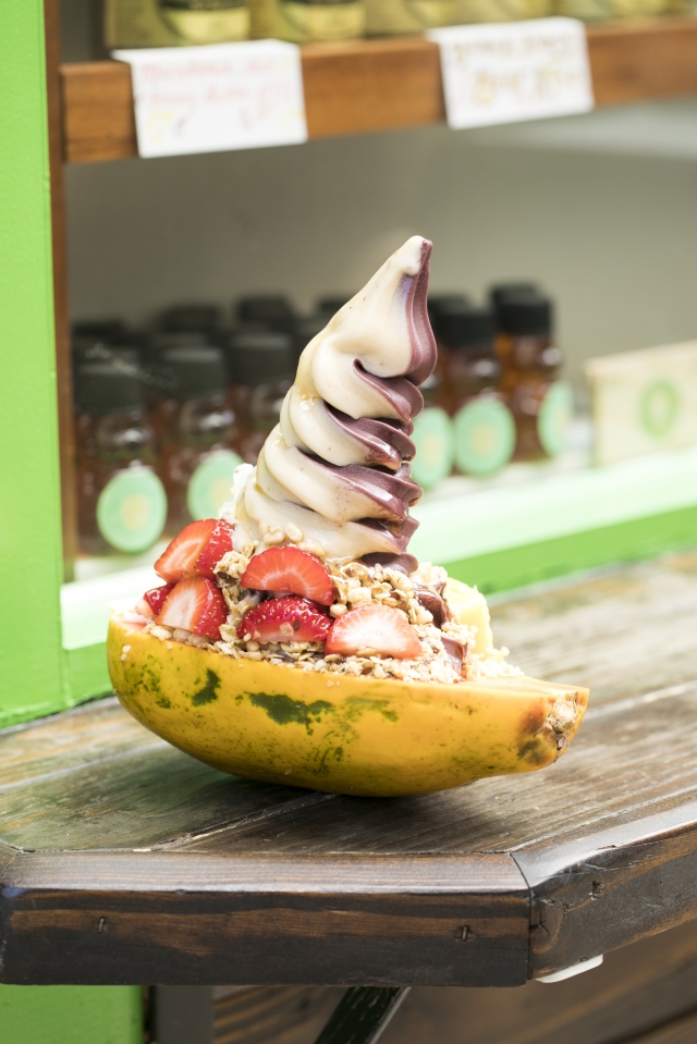 お次は楽園でついつい食べたくなる、ひんやりアイスクリーム。紹介する「バナン」は、もともとスイーツトラックで営業していたものの、今ではホノルルに数件の店を構える人気の店!昨年からワイキキのロイヤル・ハワイアン・センターにも入ったので、気軽に食べられるようになりました。なんといってもここの売りは砂糖や乳製品などを一切使わなない体に優しいアイスクリーム。バナナアイスをベースに、アサイや抹茶などさまざまなフレーバーを用意しています。写真のリッスモア(パパイヤボート)$10は、半分にカットされたパパイヤにバナナとアサイアイスを乗せたもの。フレッシュフルーツとアイスクリーム、そしてカリカリのグラノラなどいくつもの食感があわさって絶品なうえヘルシーです!