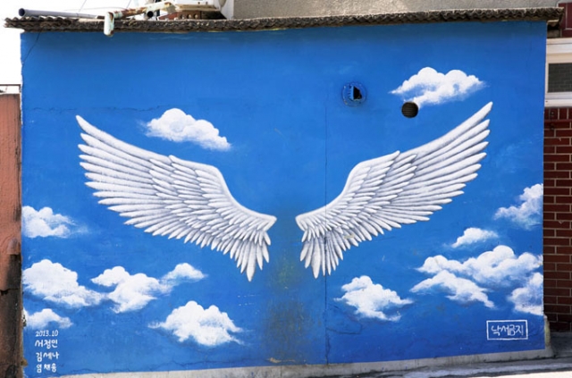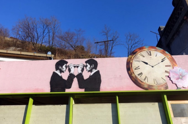 梨花洞壁画村の入り口から、駱山公園方面に丘を上がっていくと、昔ながらのノスタルジックな街並みにフォトジェニックな壁画が現れます。梨花洞壁画村は、村全体に壁画などのアートが点在する路上美術館として有名な観光スポットです
