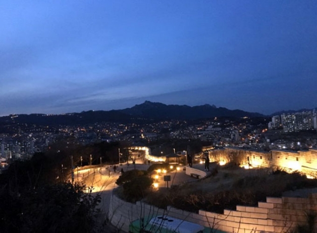 「天使の翼」の壁画から、少し丘を上がって行くと、駱山公園が見えてきます。駱山公園は、日中に訪れてもソウルの景色が楽しめてよいのですが、ぜひ、夜に訪れてみてください。城壁のライトアップとソウルの夜景は息をのむような美しさです。