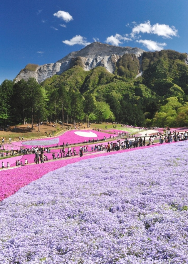 この季節秩父観光で、人気が高いのが「羊山公園 芝桜の丘」。天気がいい日には、秩父のシンボル「武甲山」(1304m)の雄姿ものぞめ秩父の大自然に抱かれた気分になります。もともと山の麓の斜面を利用し、芝桜が植栽されています。