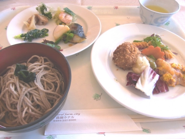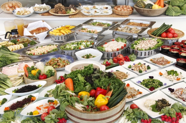 見事な眺望のレストランで、新鮮食材の食事を味わうことができます。ランチは、バイキングスタイルで家族連れにも嬉しいです。ホテル直営の農園で生産した新鮮野菜のほか、地元食材を使用したランチには、30品以上が並びます。和食、洋食と幅広いメニューが揃います。