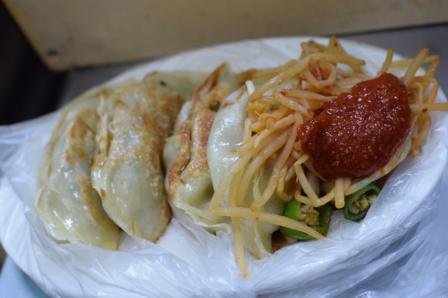 なぜか、アジュンマ(店員のおばちゃん)が「ナプチャクマンドゥ」ではなく普通の餃子をくれました。餃子に、赤いソースをつけると辛さが増し、汗が吹き出てくるほどですが、ニラの風味がきいていて美味しいです。