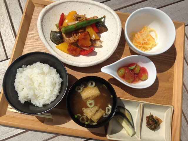 さてお待ちかねのランチタイム!地元で採れたお米、旬の野菜が使われた「トネリコランチ」取材日のメニューは、パプリカやオクラ、かぼちゃなどの夏野菜の辛味炒めに、じゃがいものシャキシャキサラダ、ミニトマトのハニーマリネ、自家製味噌を使ったお味噌汁。そして!主役のツヤツヤ炊きたてごはん!!!