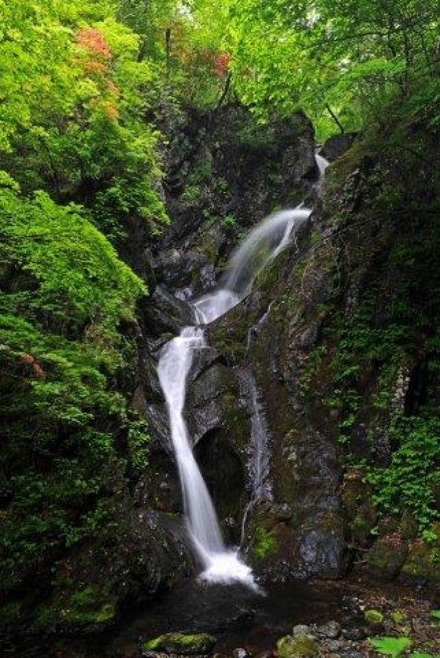 七折の滝は、鶏頭山の中腹にある滝で、高さ50mから落下する水が滝口近くに突き出た岩にぶつかり、一筋の美しい飛泉となって噴出します。これが白い虹のようになって10数mにも及び、さらに対岸の岸壁をつき、数段折れて滝つぼに注ぐさまは、まさに偉観です。