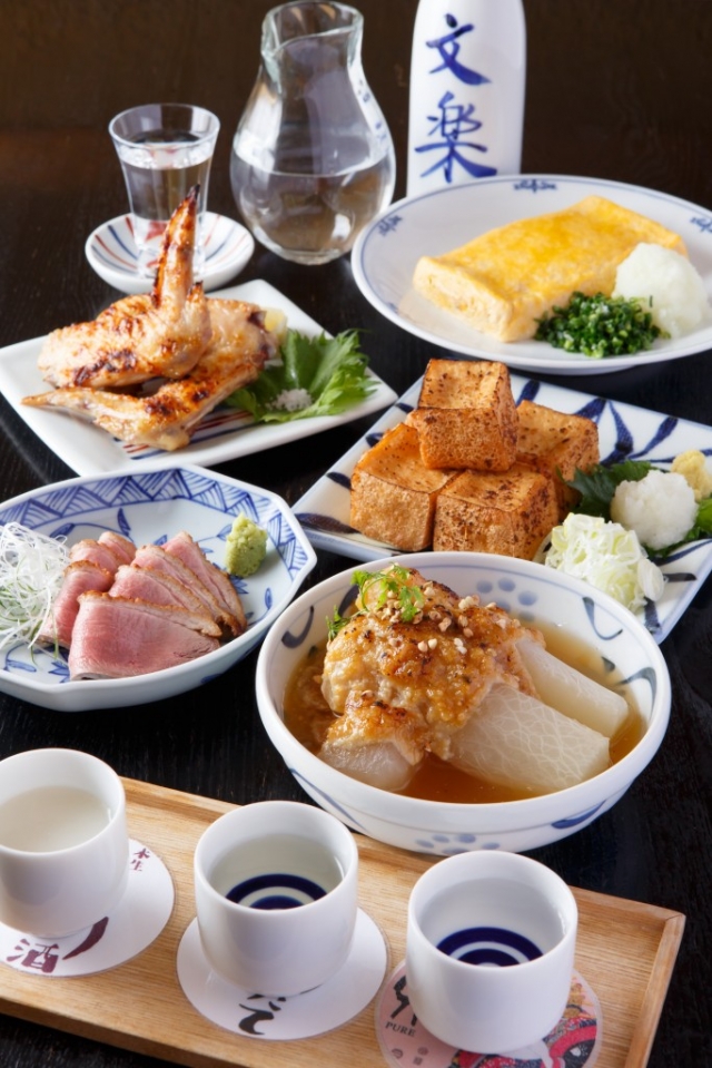 併設する「文楽 東蔵」はモダンな空間で、蔵元ならではの限定日本酒と蕎麦など一品料理が味わえます。中でも、丹精込めて造られた「大吟譲」は、ここで味わうことで蔵人の思いを感じることができるかもしれません。四角形のブルーボトルデザインが目を引く商品など、スタイリッシュなデザインは女性へのお土産にも喜ばれそう。創業120年の老舗が発信する、新スタイルの日本酒の楽しみ方にも注目です。