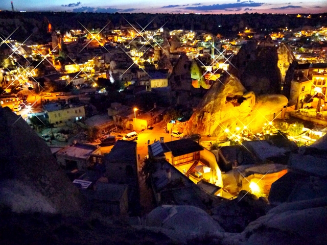 サンセットポイントという名前が付いているだけあって、サンセットももちろん観ることができます。しかし、「ギョレメ・サンセットポイント」では、ぜひ夜景を観てほしいのです。自然が造った奇岩群とホテルやレストラン、おみやげ屋のイルミネーションとのコラボレーションは、まるで映画の世界に迷い込んだかのようです。