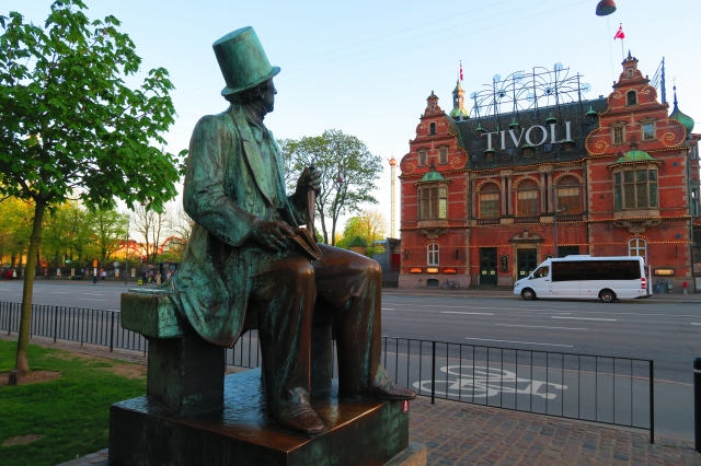 アンデルセン自身の像も市庁舎の横にあり、たくさんの人に触られ、膝がピカピカ光っています。目線の先には彼がよく訪れ、物語のインスピレーションを受けたと言われる老舗遊園地チボリ公園があります。