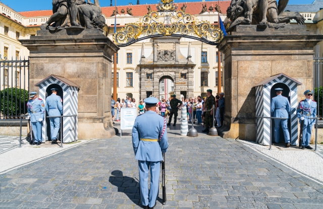 またプラハ城の正門では衛兵交代式を見ることができます。水色の制服を着た直立不動の衛兵たちが動くのは毎正時。なかでも正午のセレモニーは規模が大きいのでぜひ時間を合わせて行ってみて。