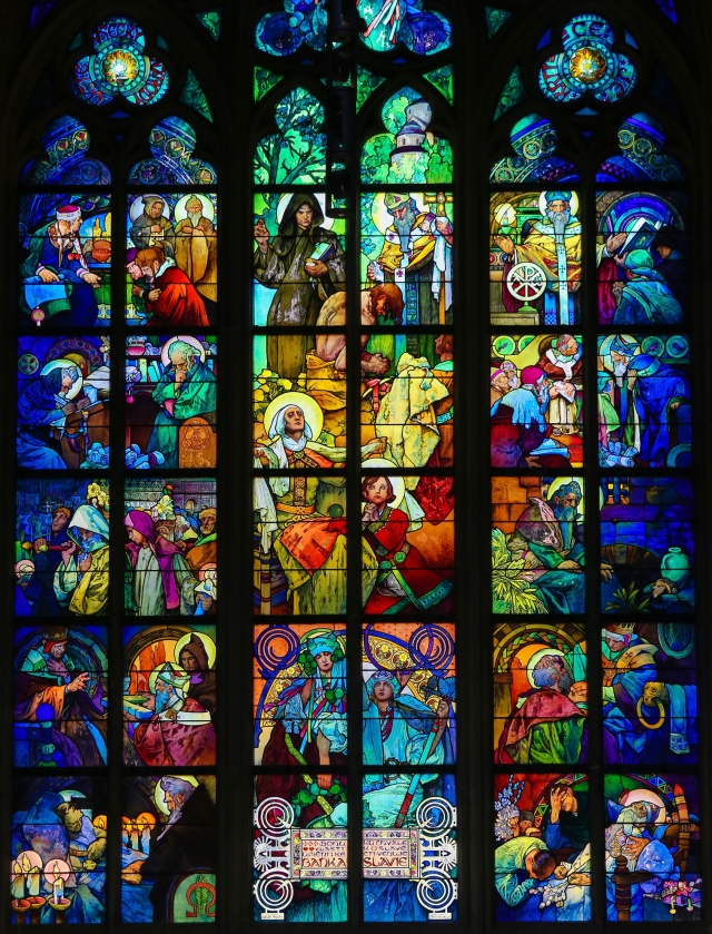 聖堂内部にはチェコの巨匠、アールヌーヴォーの奇才とも呼ばれるアルフォンス・ムハ(ミュシャ)が手がけた大きなステンドグラスがあります。チェコゆかりの聖人を美しい色合いで細密に描いたステンドグラスは圧巻。入口から見て左手前3番目にあるのでお見逃しなく。ムハの作品はこちら以外にも市民会館やムハ美術館などで見ることができます。