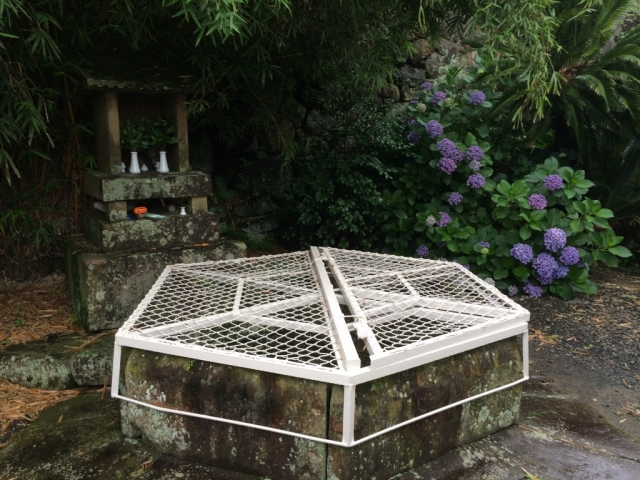 1540(天文9)年、当時の明国の商人・王直が通商を求め福江に来航、領主の宇久盛定公は黙約を結んで、福江の高台に居住地を与えました。この井戸は福江に来た中国人たちが飲料水や船舶用の水を確保するため、自ら造ったと言われています。金網越しに今も豊かな水をたたえる様子がうかがえます。六角形はその水面まで続いているそうで、この形の筒が地中に埋まっているイメージだとか。