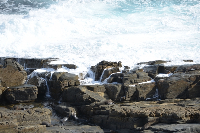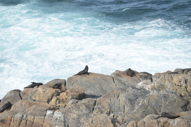 岸壁から海岸を見下ろすと、彼らが岩の上で生活をしている姿を観ることができます。岩との保護色でなかなか見つけにくいのですが、目を凝らしてみると確かに岩の上にたくさんのニュージーランド・オットセイがいます。