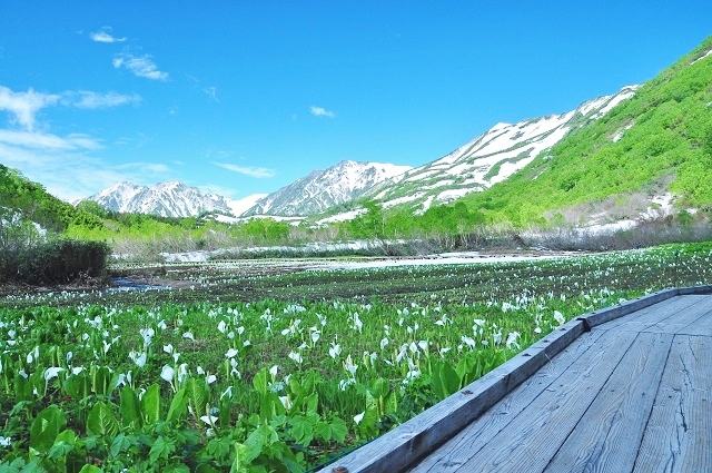 「栂池高原」は、長野県北安曇郡小谷村を中心に広がる高原です。高地にあるため、5月中は大雪原の雄大な景色が広がります。6月になると、ミズバショウ(水芭蕉)をはじめ、シラネアオイ(白根葵)、チングルマ(珍車)、ニッコウキスゲ(日光黄萓)の大群落を観ることができます。