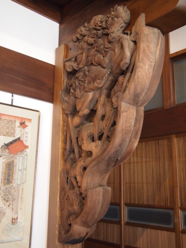 お店に入ると目につくのが大きな木彫りの飾り。こちらは当時三国街道で有名だった10メートルの大看板の一部。なんとも立派ですが明治の頃、派手という理由で撤去の命令があったそうです。