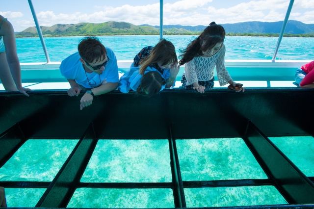 シェラトンではダイビング、スノーケリング、カヌー、カヤック、乗馬、ハイキング、ゴルフなど、多彩なアクティビティを用意している。なかでも気軽に世界遺産の海の中を見学できるのが、ボートの底がガラスになった「グラスボトム・ボート」。大人2800CFP、子供(3〜12歳)1800CFP、所要90分。小さな子供でも安心して乗れて、楽しめる。