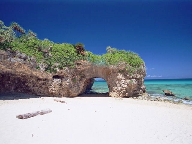 最初におすすめする観光スポットは、砂山ビーチです。沖縄県宮古島の砂山ビーチと言えば、日本のビーチランキングで常に上位にランクインする絶景ビーチです。遥か先まで透き通るコバルトブルーの海をバックに、真っ白で巨大な砂山と岩でできた天然のアーチは、リゾート気分を一気に盛りあげてくれます。