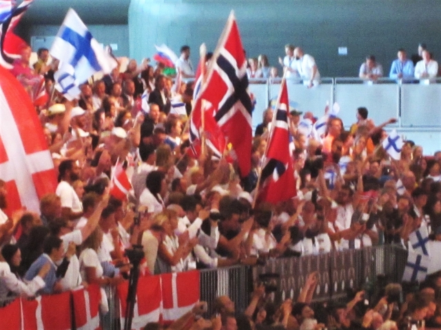 館内では、それぞれの国の応援団が国旗を掲げ、熱い声援を送ります。