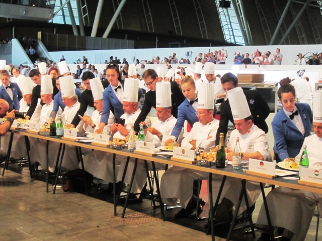 審査員の試食と同時に、プレス席にも料理が披露されます。見事にデコレーションされた大皿は、各国のこだわりがあり、それは見ごたえのあるものでした。そして、それらの大皿を運ぶのは、なんとピエモンテ州のスターシェフ達。食の世界に生きる筆者にとっては、なんともぜいたくな光景でした。