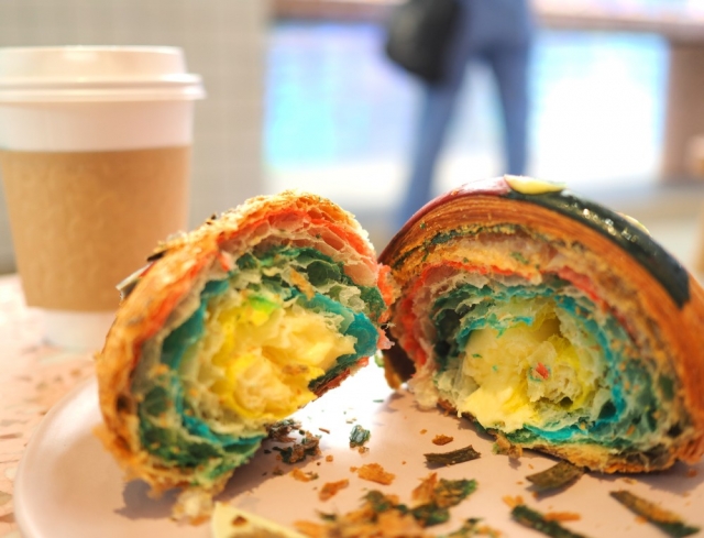 プライド・クロワッサンは、見た目もパンチがありますが、中を見るとさらにビックリ! きれいな虹色に包まれたカスタードクリームが出てきます。このクリームはなんだかラベンダーのような香りがして、とても独特です。
