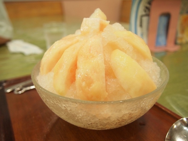 桃ひとつを八等分にしたものが上にどっさり、食べ進めると中からサイコロ状の桃も出てきます。氷も柔らかく掻いてあり、食べて満足のかき氷です。