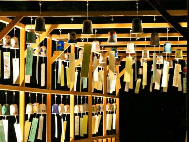 小路を歩くと、およそ100個の風鈴のトンネルをくぐります。ここは、風鈴オブジェ「涼の小径」と呼ばれています。トンネルには、地元の小学生のイラストとともに「自分の街おかやま」や「願い事」を書いた風鈴がぶら下がり、涼しさを演出しています。