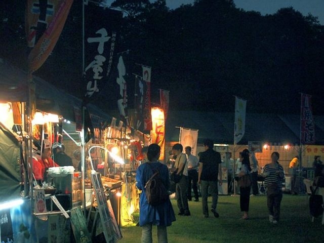 ここでは、のぼりを立てた屋台が一面に並んでいます。何よりも、まず味わってほしいのが、岡山ならではのメニューです。千屋牛の串焼き、県内産の野菜をふんだんに使ったピッツァ、連島産のれんこんのチップス、瀬戸内マッシュルームの天ぷらなどがあります。