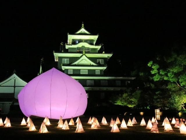 戦国大名・宇喜多秀家によって築かれた岡山城は、黒漆塗りの板が取り付けられた外観から「烏城(うじょう)」と呼ばれています。「烏城灯源郷」は、「烏城を包むやわらかな灯り」をテーマに、旭川の川面に映る岡山城天守閣とその周辺をライトアップします。